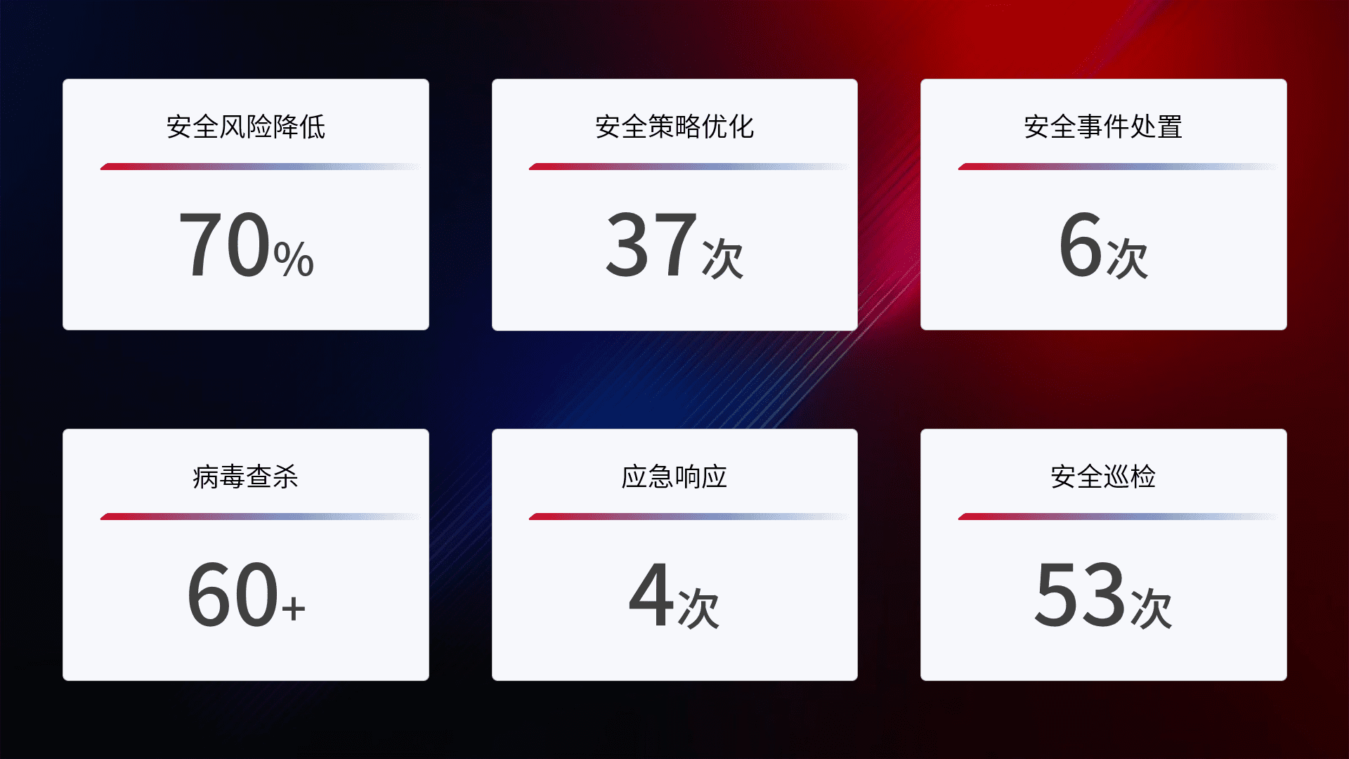 提供全面的安全事件报告体系,,,,包括处置报告、、、、周报、、、、季度和年度总结,,,,结合持续监控,,帮助客户深入了解网络安全状况。。。。